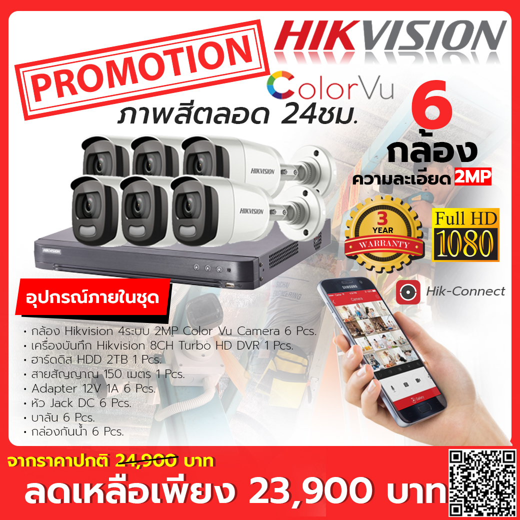 โปรพิเศษ ลดราคาทุกชุด Hikvision Color Vu Camera 6 ตัวพร้อมติดตั้ง ราคา 23,900.00 .-